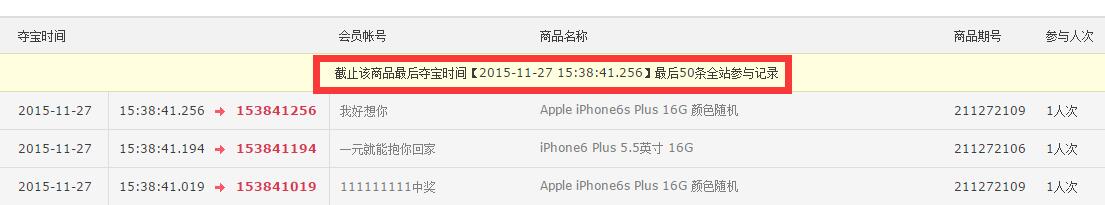 图五、全站最新50条夺宝记录时间列表