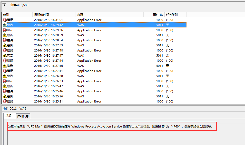 日志中大量报错,IIS严重错误,此类错误默认情况下5分钟连续出现5次会导致IIS应用程序池直接挂掉,挂掉之后应用基本上是废掉了,访问量越高,挂的越快!