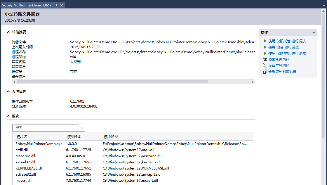 1、双击DMP文件会直接进入VS,可以看到Summary信息