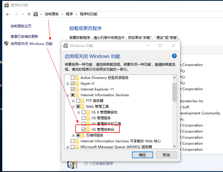 1、在控制面板→程序→启用或关闭Windows功能→勾选Internet Information Services以及Web管理工具下的IIS管理控制台
