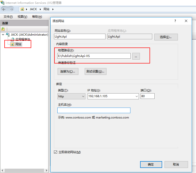 1、添加一个网站,设置一下名称,并将路径指向你刚才发布的文件夹,然后启动网站即可
