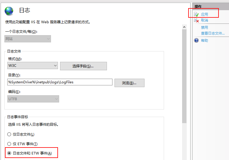 4、设置IIS的日志记录方式为日志文件和ETW事件