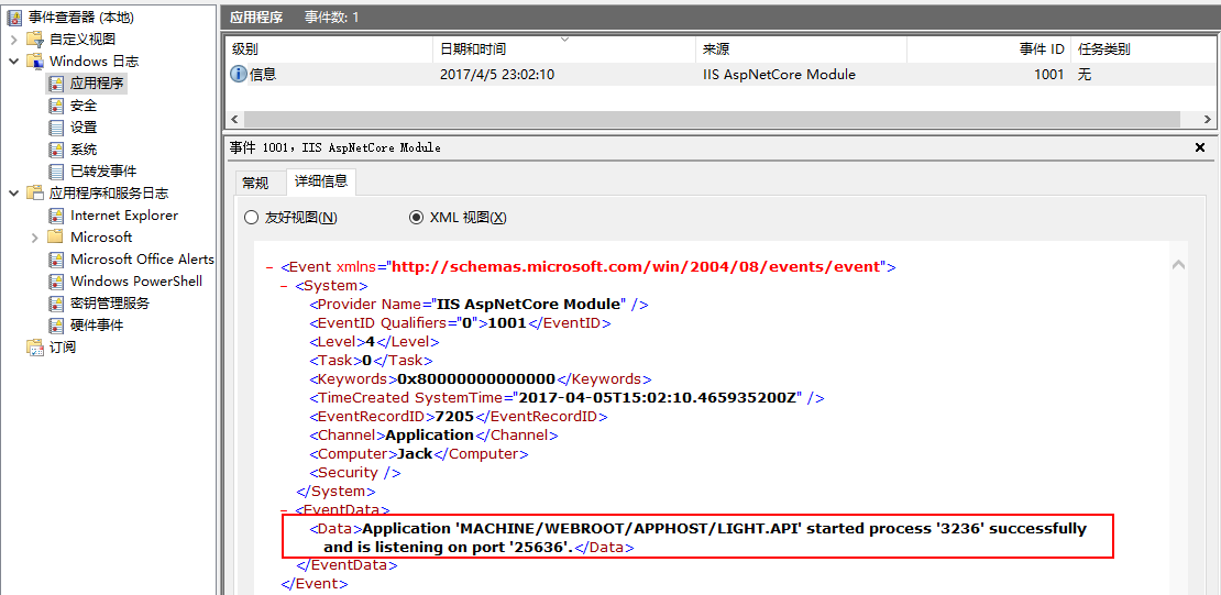 5、重新访问网站,然后打开Windows应用程序日志,你会看到这样一条信息。意思是说你的应用程序已经由PID为3236的进程启动,并且在25636的端口上监听着。